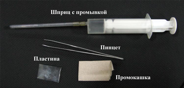 5. Поливаем промокашку промывкой со шприца. Промывку желательно немного подогреть, опустив шприц с набранной промывкой в теплую воду на несколько минут.